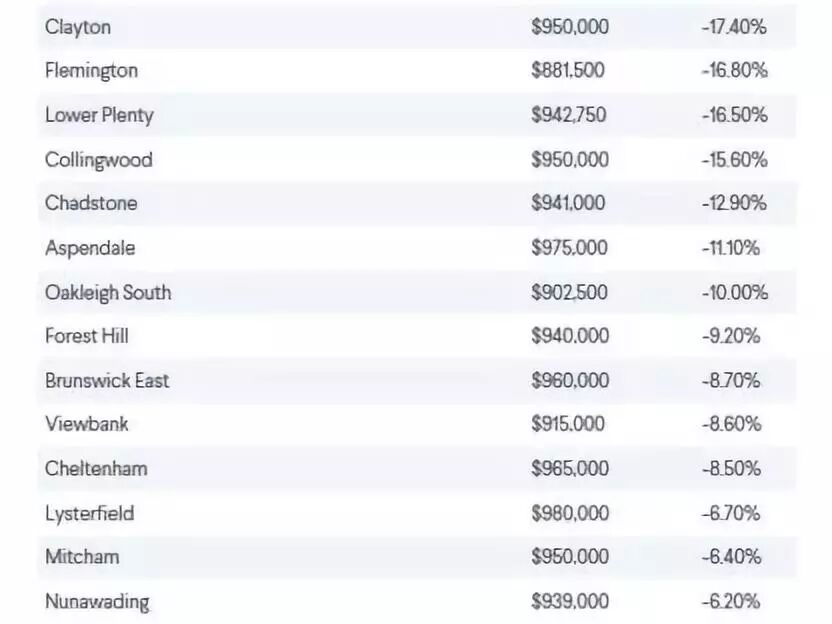 前五位的另外四名是Flemington、Lower Plenty、Collingwood和Chadstone,它们的房价跌至七位数以下。去年12月,Flemington的房价中值跌至88.15万元的低点。尽管郊区房价受到了冲击,但它们仍高于墨尔本的整体房价中值。