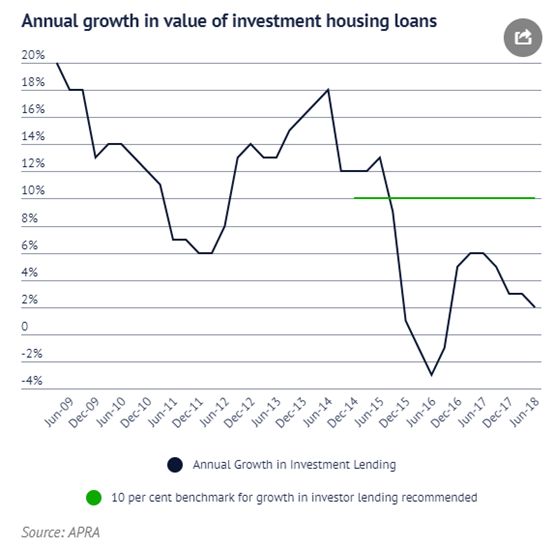 跟过去房市低迷由于整体经济衰退,或者高贷款利息不同,最近的房市低迷是由于政府的贷款政策紧缩导致:经济依然上涨,贷款利率相对较低。2015年政府宏观审慎局(APRA)建议投资者的抵押贷款不应超过每年10%。