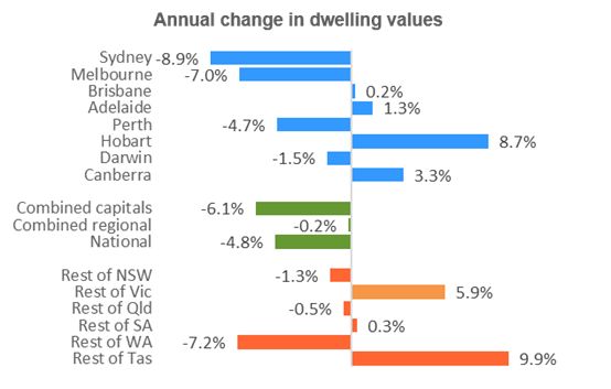 过去一年里,澳洲各大住宅价值变化如下: