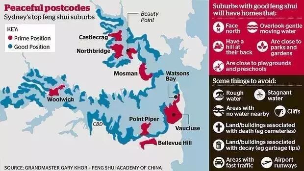 若以悉尼为例,则是山和海港之间的互动关系,最好的城区房产应当背山面水,而Mosman区内广东人的房子基本都是这样,而且还是朝北向的。