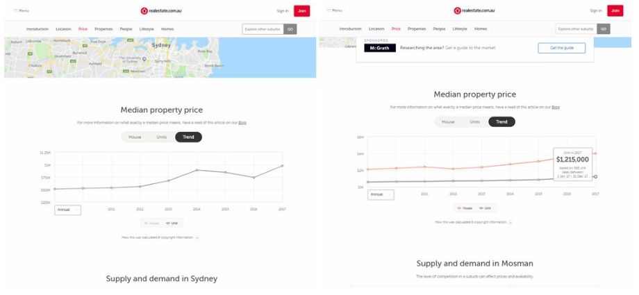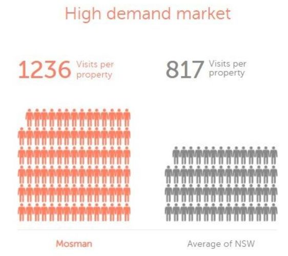 下图是来自REA网站的楼市供需数据,Mosman每套在售房产每月的平均网络访问量是1236,大大高于新洲平均访问量817。