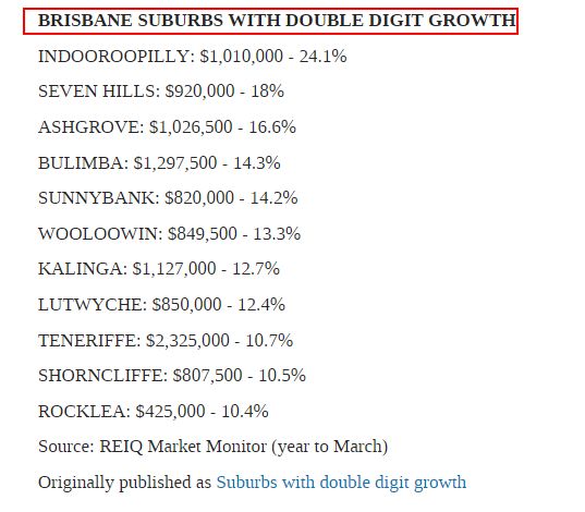 另外根据行业内的数据表示,布里斯班这些区的房价都在两位数的增幅速度在增长: